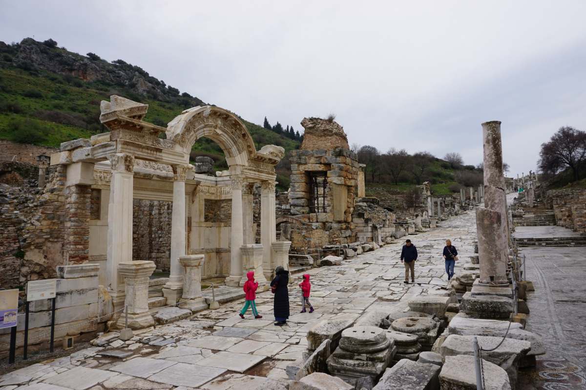 Efes'teki en önemli dini yerlerden biri, MS 2. yüzyılda inşa edilen Hadrian Tapınağı'dır. Tapınak, Roma İmparatoru Hadrian'a adanmıştır ve dört Korinth sütunlu bir cepheye ve tanrıça Artemis'in hayatını tasvir eden bir frize sahiptir.